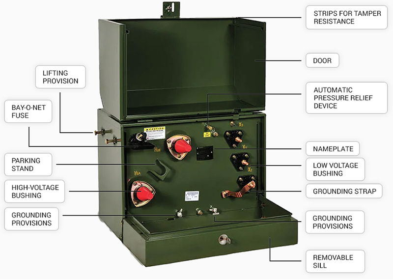 Pad mount transformers are ground-mounted distribution transformers enclosed in a metal cabinet, usually located on a concrete pad. This type of transformer, enclosed in a grounded metal box with all live contact points, can be installed in residential areas without fencing, unlike transformers in substations.